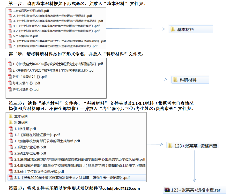 资格审查材料提交要求:请于6月7日24:00之前把资格审查材料按如下图片操作压缩打包以“考生编号后三位+考生姓名+资格审查”命名后发至cufekjphd@126.com。邮件主题为“考生编号后三位+考生姓名+资格审查”。提交时请仔细检查,请勿重复提交。资格审查材料格式可为pdf或图片,如果使用图片,需确保拍摄清晰完整。