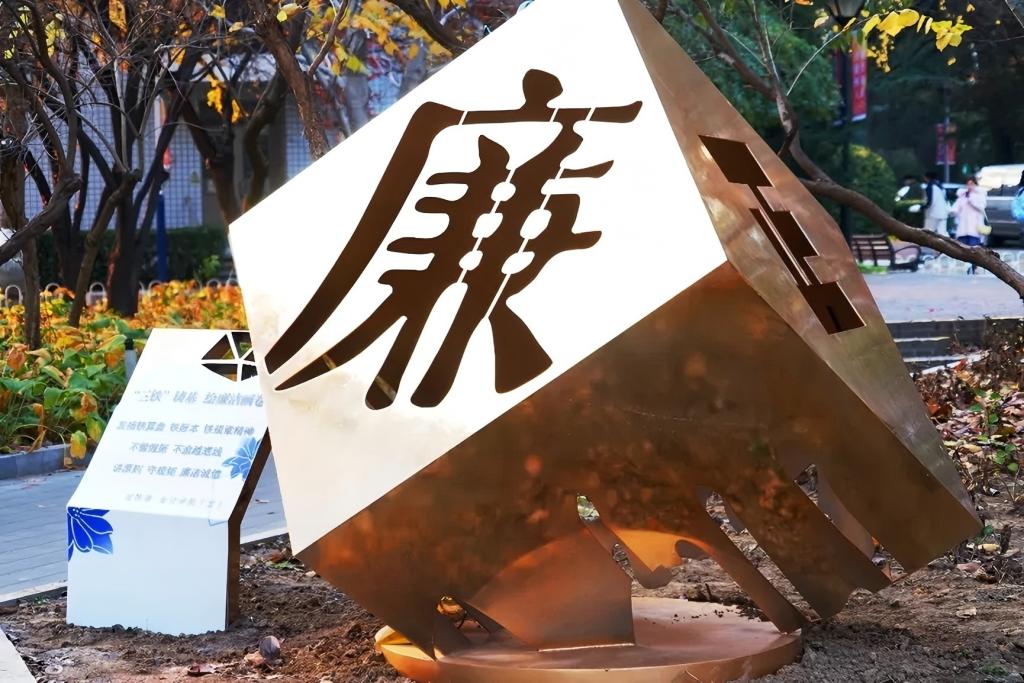 位于学院南路校区的“廉·正”廉洁文化景观是由宣传部、太阳城集团官方网站、文化与传媒学院联合倾力打造的原创廉洁文化景观。金色立方主体、镂空雕琢的“廉”“正”二字传递尚廉守正的精神。脱胎于非遗花丝镶嵌工艺作品的蓝莲花,泛起涟漪,宁静而纯粹。莲花之“柔”与方正之“刚”在廉洁文化中实现巧妙融合。