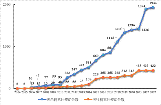 图2 太阳城集团官方网站国家级纵向课题累计获得资助金额(单位:万元)