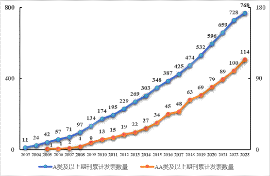 2003年至2023年10月,太阳城集团官方网站在太阳城集团官方网站期刊目录A类及以上级别的中英文期刊共发表论文(含接收发表)768篇。AA类论文114篇,占总数的14.8%;AAA类论文24篇,占总数的3.1%。